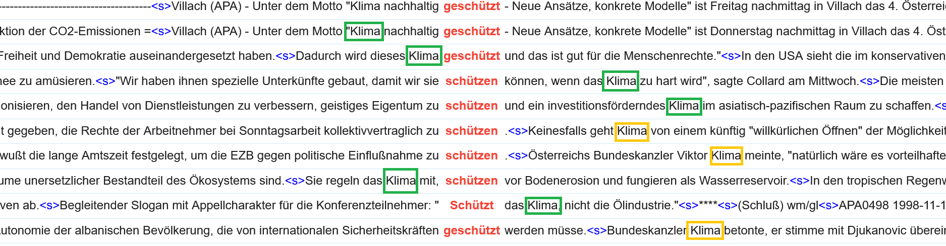 Also: suche nach “Ball” innerhalb von Artikeln, die nicht aus dem Sportressort stammen, und in denen auch Walzer, Polonaise, Champagner oder Mitternachtseinlage vorkommen. Damit schränkt sich die Trefferanzahl für “Ball” im amc von ca. 800.000 auf “nur noch” ca. 50.000 ein. (Aber freilich gibt es darunter immer noch Artikel über Fußball, die nicht korrekt mit Sportressort markiert wurden und in denen Siege mit Champagner gefeiert werden, oder Spieler mit dem Eigennamen “Walzer” vorkommen)
